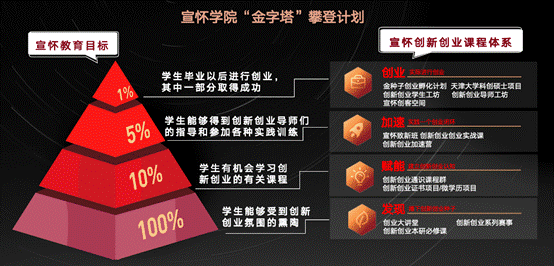 同時,天津大學(xué)宣懷學(xué)院以"四個百分比"為創(chuàng)業(yè)教育目標,構(gòu)建了獨具特色的創(chuàng)新創(chuàng)業(yè)人才培養(yǎng)體系,即通過創(chuàng)新創(chuàng)業(yè)生態(tài)建設(shè),讓天津大學(xué)100%的學(xué)生能夠受到創(chuàng)新創(chuàng)業(yè)氛圍的熏陶,10%的學(xué)生有機會學(xué)習(xí)創(chuàng)新創(chuàng)業(yè)的有關(guān)課程,5%的學(xué)生能夠得到創(chuàng)新創(chuàng)業(yè)導(dǎo)師們的指導(dǎo)和參加各種實踐訓(xùn)練, 1%的學(xué)生畢業(yè)以后進行創(chuàng)業(yè),其中一部分取得成功。圍繞這一目標,學(xué)院創(chuàng)新推出"金字塔攀登計劃",實現(xiàn)創(chuàng)新創(chuàng)業(yè)人才“發(fā)現(xiàn)—賦能—加速—創(chuàng)業(yè)”、從理論到實踐再到實戰(zhàn)的進階式培養(yǎng)。