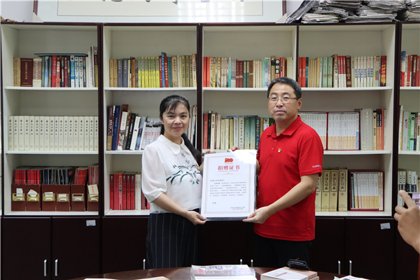 丁曉玲代表老同志們感謝出版社黨總支積極為老同志辦實事的暖心舉措。今年是中國共產黨建黨百年華誕,全黨開展黨史學習教育。出版社黨總支聚焦老同志的特點和需求,為老同志辦實事,從今年開始,每年都會精心挑選適合老同志的書籍,捐贈給老同志們,豐富老同志的文化生活。特別感謝出版社黨總支這一關心關愛老同志們的長效機制,離退休工作處將充分利用好這些書籍,豐富老同志們的精神文化生活。隨后,丁曉玲代表離退休工作處向出版社黨總支贈送了捐贈證書。
