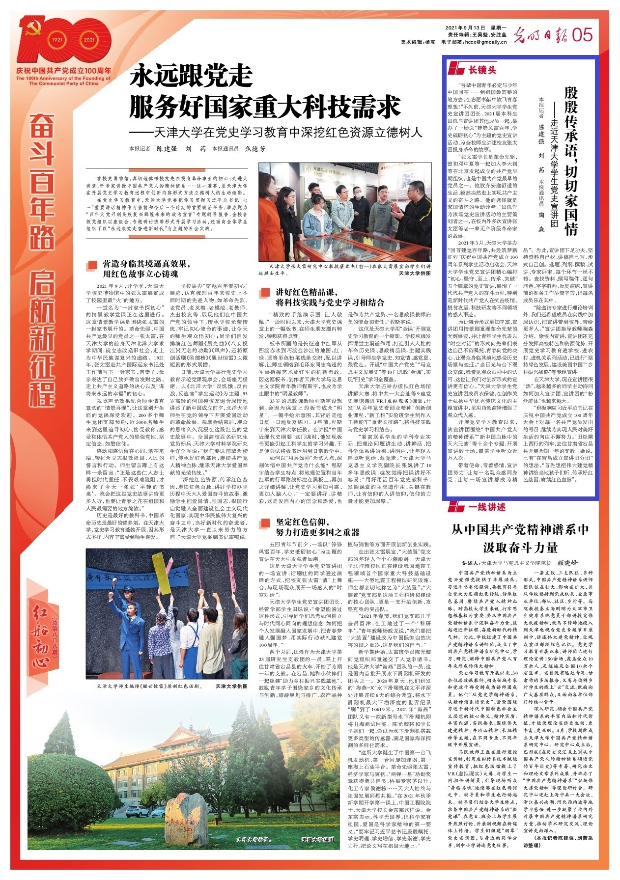 2021年3月,天津大學舉辦“回首建黨百年路,共赴筑夢新征程”慶祝中國共產黨成立100周年系列學生活動啟動會,天津大學學生黨史宣講團精心編排“初心、堅守、至上、傳承、突破”五個篇章的黨史宣講,展現了一代代共產黨人的奮斗歷程,特別是新時代共產黨人在抗擊疫情、脫貧攻堅、科技研發等不同領域的感人事跡。