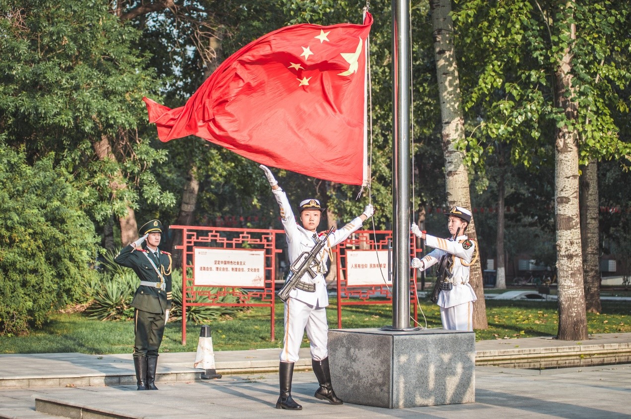 北洋廣場上,伴隨著激昂的《義勇軍進行曲》,鮮艷的五星紅旗在朝陽下冉冉升起,迎風飄揚。北洋廣場上的“青馬”與屏幕另一端的“小青苗”,跨越千里,共同舉行了一場莊嚴肅穆的升旗儀式。