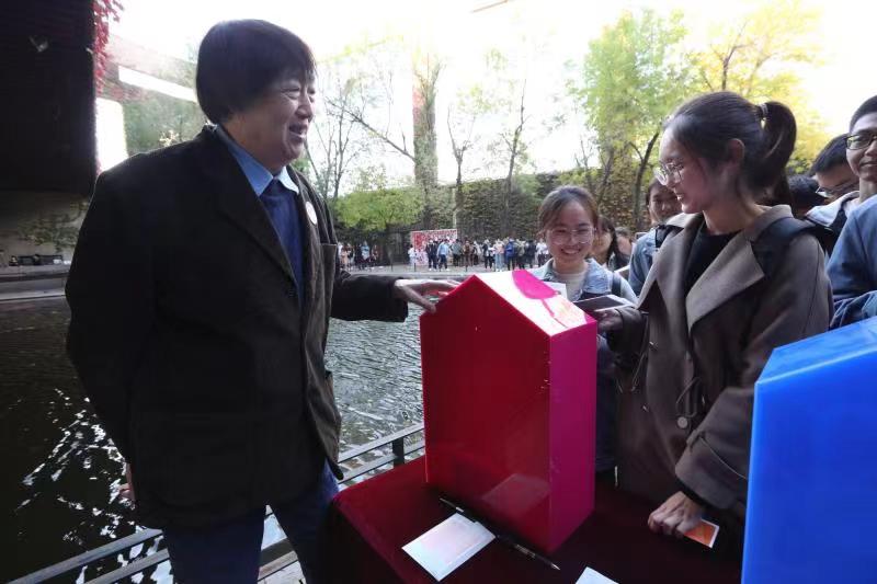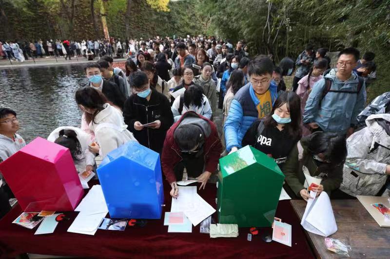 碧綠的竹林旁,“寫給明天的自己”活動(dòng)區(qū)域,尤其引人注目。三座“心愿臺(tái)”立在澄心池畔,擺著筆和彩墨。領(lǐng)取了精美的心愿卡之后,學(xué)生們可以在此寫下自己未來幾年的期許、愿望、向往和小目標(biāo),裝進(jìn)信封。心愿卡的副券恰好是一枚“紅葉”,可以剪下來,當(dāng)場穿上絲帶或流蘇,做成書簽。三個(gè)不同顏色的信箱,分別標(biāo)著2022、2023、2024三個(gè)年份,想把信寄給哪一年的自己,就投進(jìn)哪個(gè)信箱。到了那一年的“紅葉季”,便可以憑借“紅葉”副券,取回自己的信。“當(dāng)明天的你拆開幾年前寫給自己的信時(shí),看看你是否實(shí)現(xiàn)了愿望,成為了你曾向往的那個(gè)自己?”院長馮驥才先生對(duì)同學(xué)們說。他表示,“寫給明天的自己”將成為今后每一屆“紅葉季”的常規(guī)活動(dòng),“這個(gè)浪漫的行為,不僅能幫助青年學(xué)子們留住時(shí)光帶給自己的一份充滿情感的紀(jì)念,還是一種潛移默化、潤物無聲的人文教育,能夠不斷啟發(fā)他們對(duì)自我和人生的追求、認(rèn)識(shí)及感悟。”