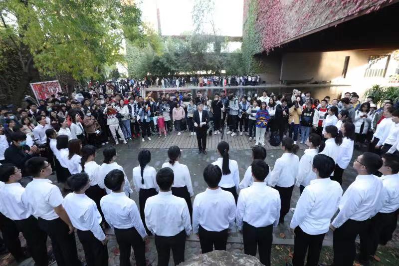 澄心池另一側(cè)的“詩歌音樂沙龍”,全由同學(xué)們自發(fā)表演:中外詩文朗誦、吉他彈唱、口琴笛子演奏、弦樂四重奏,甚至還有同學(xué)跳起舞蹈,享譽(yù)全國的“北洋合唱團(tuán)”也帶來他們的歌聲。詩人徐志摩的銅像旁邊,一面“紅葉詩墻”貼滿了今年“紅葉季”征集的攝影、詩歌作品,引人駐足欣賞。還有不少喜歡畫畫的學(xué)生,背著畫夾來這里寫生,或者撿拾紅葉,制作葉脈畫……伴隨著詩歌與音樂,大家徜徉在畫境中,盡情享受這個(gè)美不勝收的秋日。