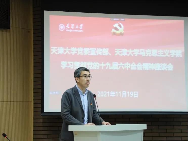 本站訊(通訊員 張鷟)為深入學習宣傳黨的十九屆六中全會精神,推動學習宣傳和研究闡釋深入開展,進一步把思想和行動統一到中央部署和要求上來,11月19日,天津大學黨委宣傳部與馬克思主義學院共同舉辦的學習貫徹黨的十九屆六中全會精神座談會在33教學樓召開。宣傳部部長呂靜,副部長李嘉毅、劉一,馬克思主義學院院長顏曉峰參加會議,與馬克思主義學院全體師生黨員和宣傳部黨支部全體黨員共同展開學習和研討。會議由馬克思主義學院黨委書記徐斌主持。與會師生圍繞《中共中央關于黨的百年奮斗重大成就和歷史經驗的決議》和習近平總書記關于《決議》的說明,交流學習體會,進行主題發言,并提出了抓實學習的目標任務和貫徹落實的工作著力重點。