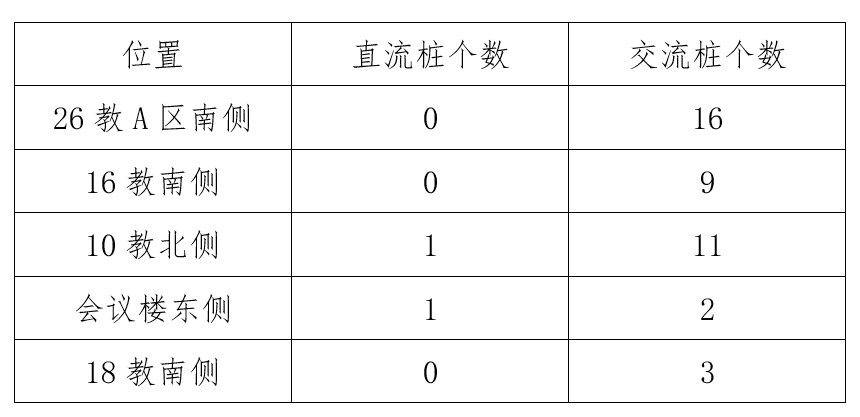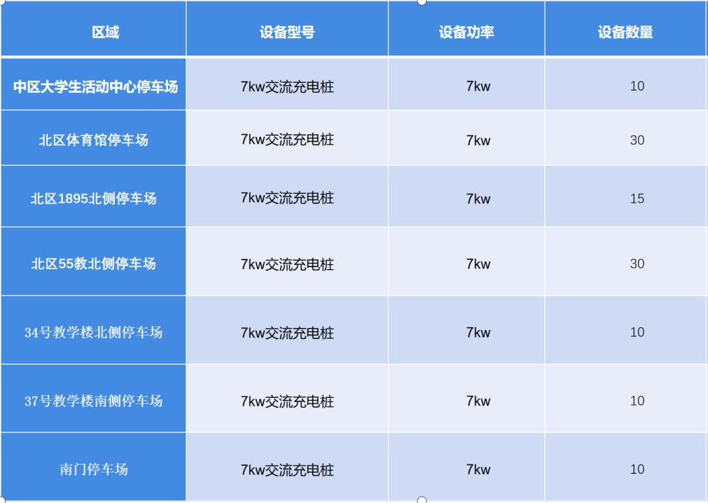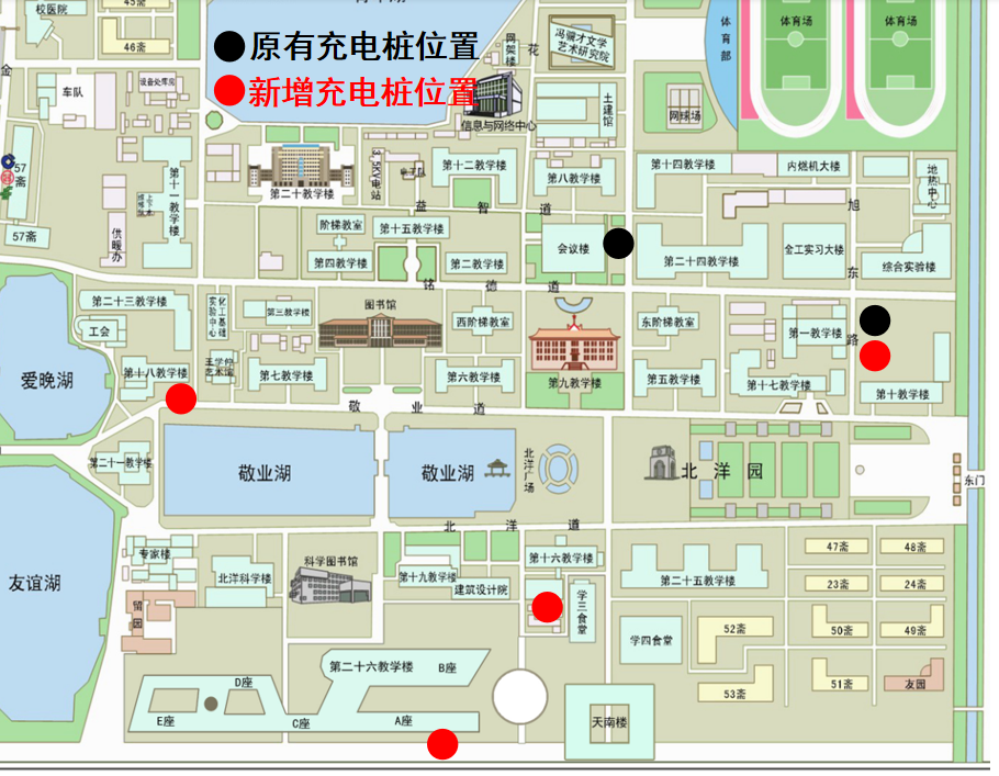 據了解,目前北洋園校區充電樁目前僅有兩處,分別在桃園餐廳停車場和1895樓后停車場,共有7KW有9個樁,60KW有6個樁12個充電頭。二期建設預計新增7處,其中南區3處、北區3處、中中區一處,新增充電頭115個,預計8月10日完成施工。