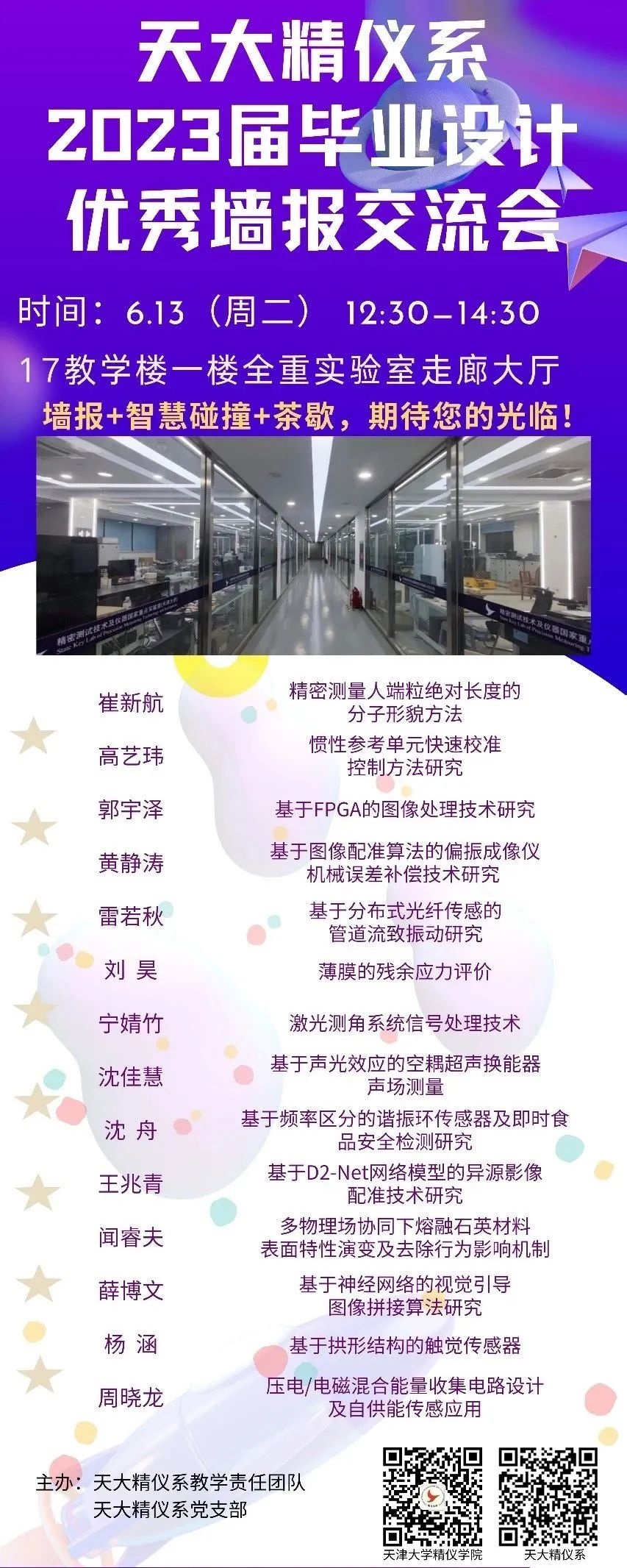 本次活動的籌備涉及墻報模板設計/印刷、展板設計/安裝、會場布置等眾多環節,交流會的組織得到了精密儀器工程系師生黨支部的鼎力支持和熱情響應。師生黨支部以此次交流會的籌辦和學術交流為契機,通過“共學、共建”,推動了師生之間的溝通和交流。