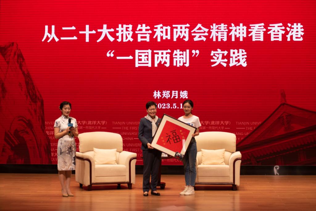 在交流環節,林鄭月娥回答了同學們所關心的關于香港未來發展、人才引進、內地青年如何更好在港發展等方面的問題,她向天大師生發出邀請,歡迎天津大學的優秀青年赴港旅游、進修、工作和發展。天津大學學生代表向林鄭月娥女士贈送了天津大學神經工程團隊通過腦機接口技術書寫的福字紀念品。