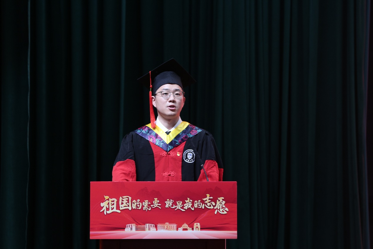畢業(yè)生黨員代表、材料學(xué)院2024屆博士生巴凌志講述了自己求學(xué)時(shí)被學(xué)校氛圍熏陶、導(dǎo)師言傳身教的故事,立志將七年間在天大習(xí)得的知識(shí)和本領(lǐng)融入到“兩彈一星”精神中去,做民族脊梁,為國之重器的研制生產(chǎn)貢獻(xiàn)屬于自己的一份“天大”力量。